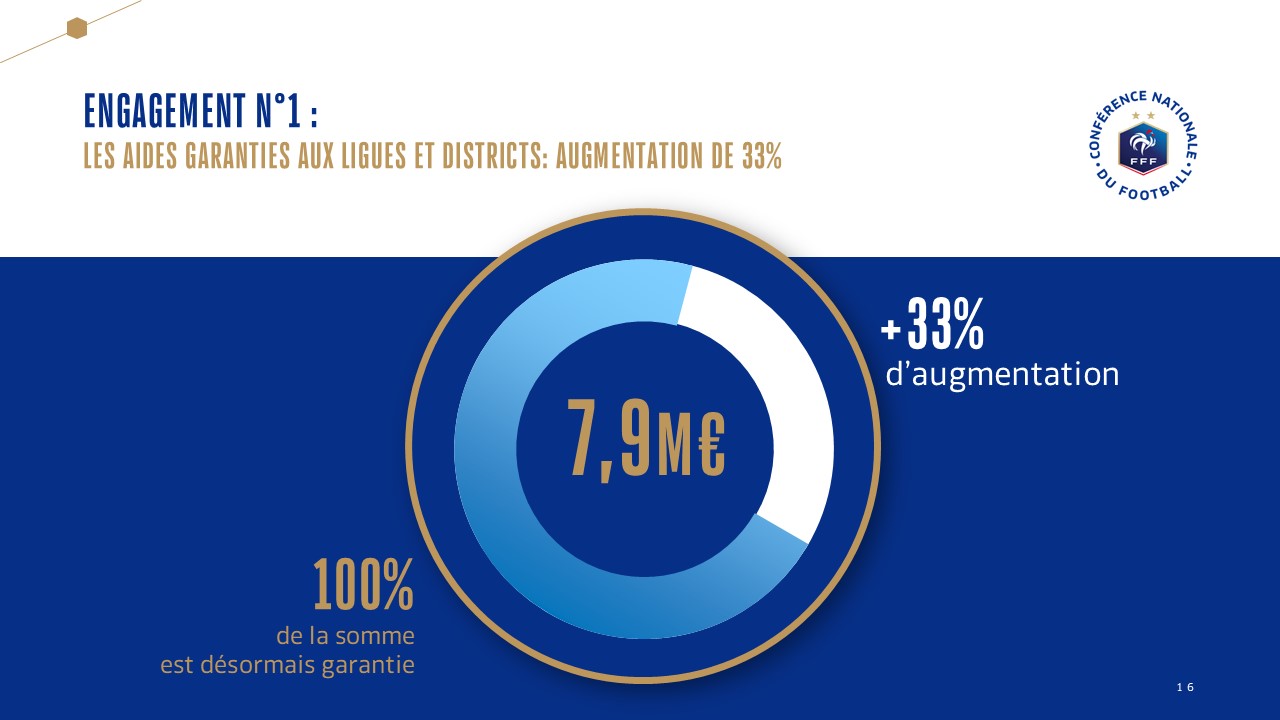 - Désormais, 100 % des montants sont garantis, sous réserve du respect des directives fédérales et de la mise en œuvre d’un plan d’actions tenant compte des quatre priorités fédérales : structuration des clubs ; développement de la pratique (football éducatif, futsal, foot santé) ; déploiement du plan 500 000 licenciées ; engagement sociétal (lutte contre les VSS, inclusion, environnement).