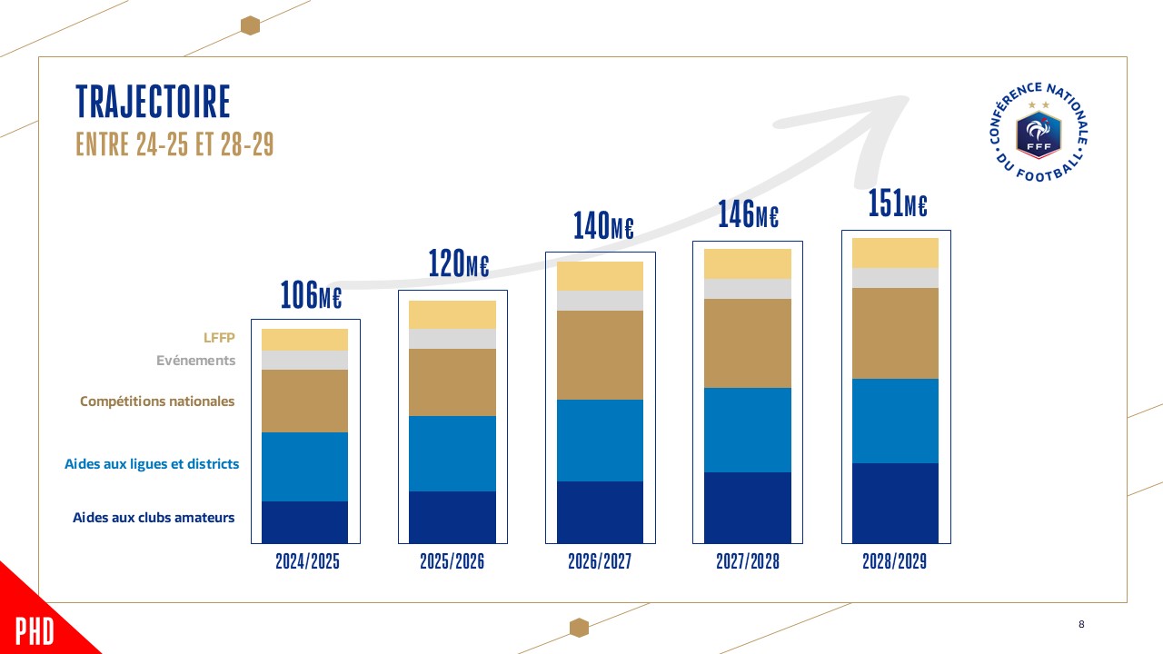Cette Conférence, qui a rassemblé les représentants du football amateur au CNF Clairefontaine (Yvelines), marque un changement d’ère pour le football amateur français. Fruit d’une démarche inédite de concertation et de co-construction avec les ligues et districts, cette nouvelle feuille de route s’appuie sur une trajectoire financière pluriannuelle sans précédent : l’enveloppe globale consacrée au football amateur, au football féminin et aux clubs nationaux augmentera de 50 % en cinq ans. Elle passera ainsi de 106 M€ pour la saison passée à 151 M€ en 2028-2029, soit un investissement global de plus de 550 M€ en quatre saisons.
