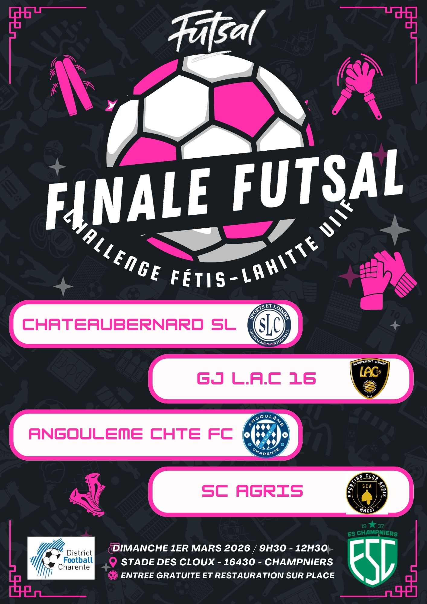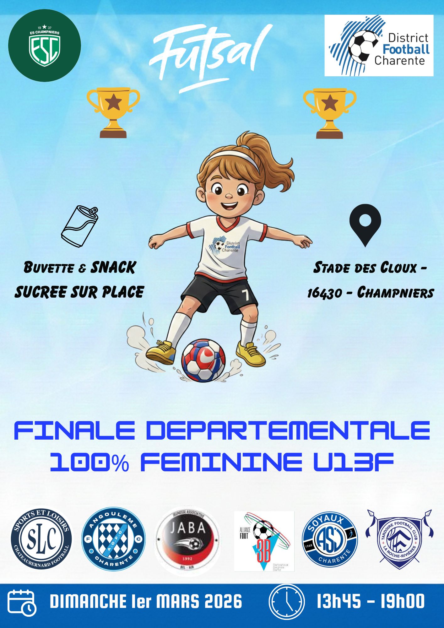 Le dimanche 1er mars 2026, sur les installations de Champniers, se dérouleront les finales départementales des Challenges « Fétis-Lahitte » et « 100% Féminin » (épreuves filles) ; Après une phase de qualification s’étant étendue durant les mois de janvier et de février où nos équipes se sont affrontées, cet évènement viendra marquer de la plus belle des manière cette initiative des Commissions « Foot Féminin » et « Foot diversifié ».