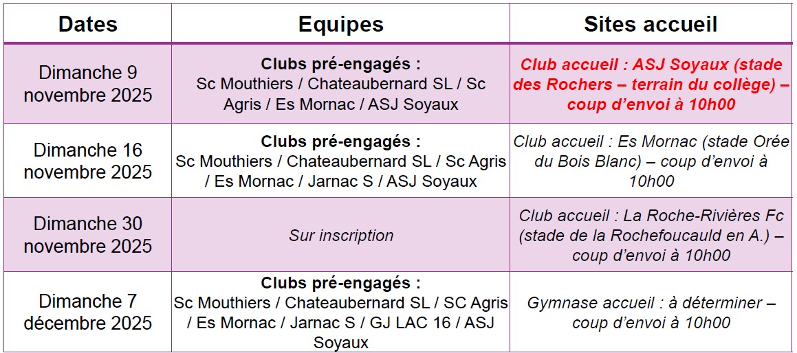 P.S : vous avez à minima 4 joueuses des années d’âges concernées et vous souhaitez participer sur la date du 7 décembre 2025 ? C’est possible ! Merci de prendre contact avec le Conseiller Technique en charge de l’action, M. MARTINEZ Léo (06.23.15.81.12 ou lemartinez@foot16.fff.fr).