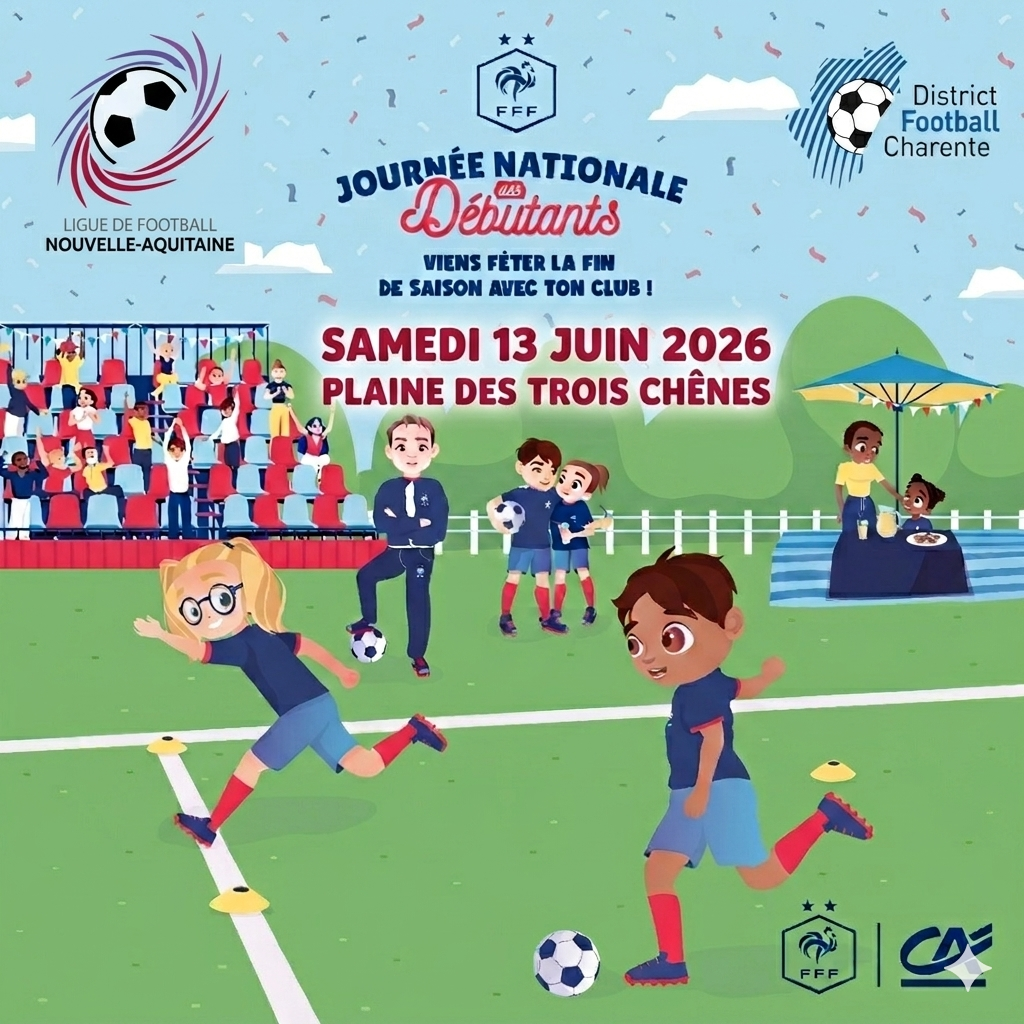 Dans le cadre de la pratique du Football d’Animation, le District de la Charente mets en place son traditionnel évènement de fin de saison, la « Journée Nationale des Débutants ». Le samedi 13 juin 2026, sur la plaine des jeux des 3 Chênes, se déroulera cet ultime rassemblement qui viendra clôturer la saison pour le football d’animation et plus précisément pour nos jeunes licenciés provenant des catégories U7 et U9.