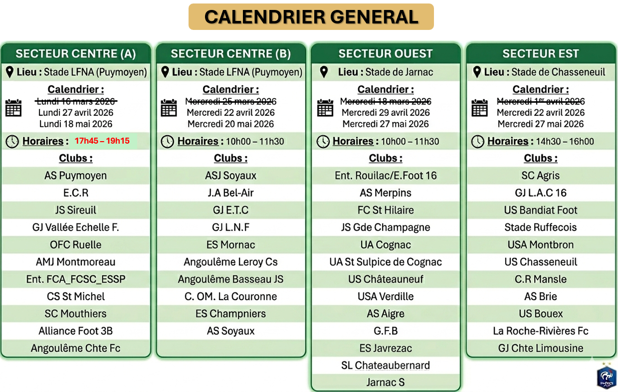 - Mercredi 22 avril 2026 : stade de Chasseneuil – 14h15 à 16h00.