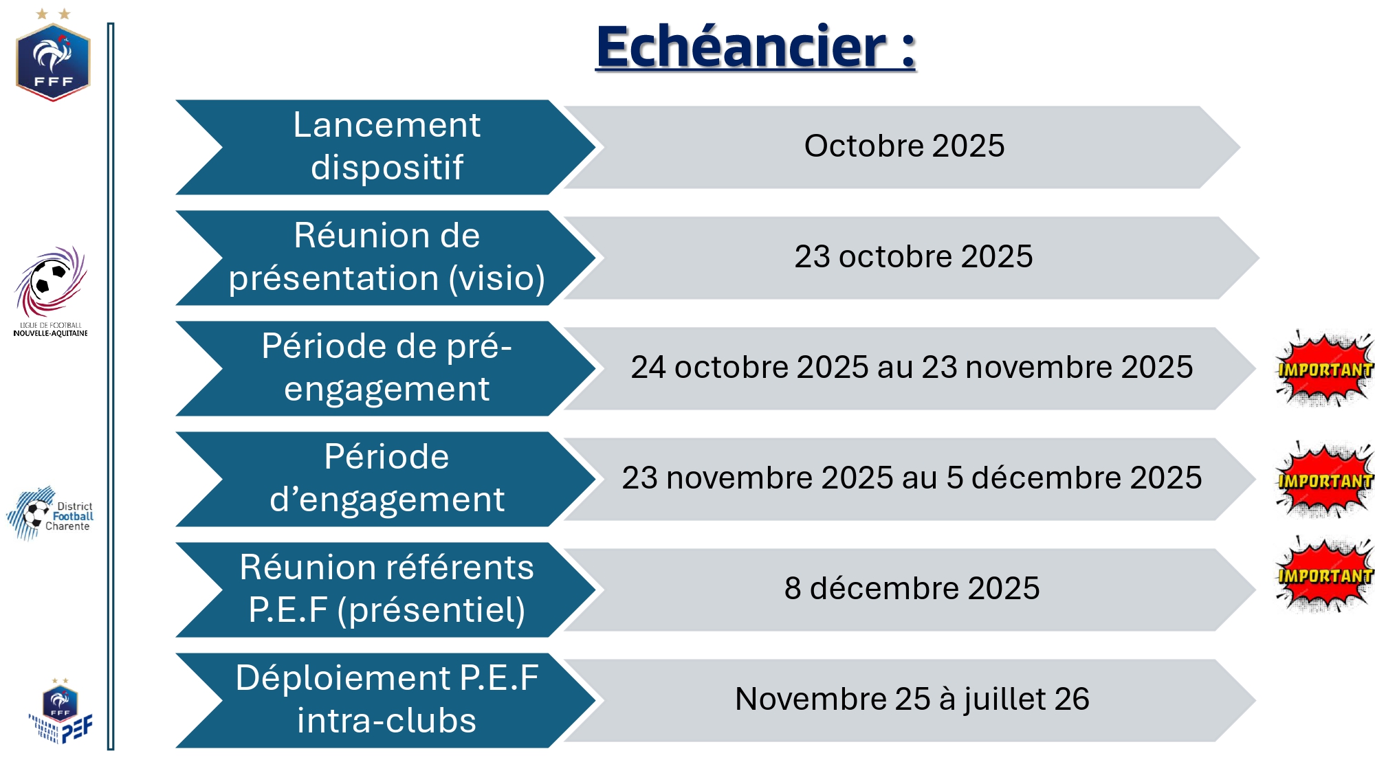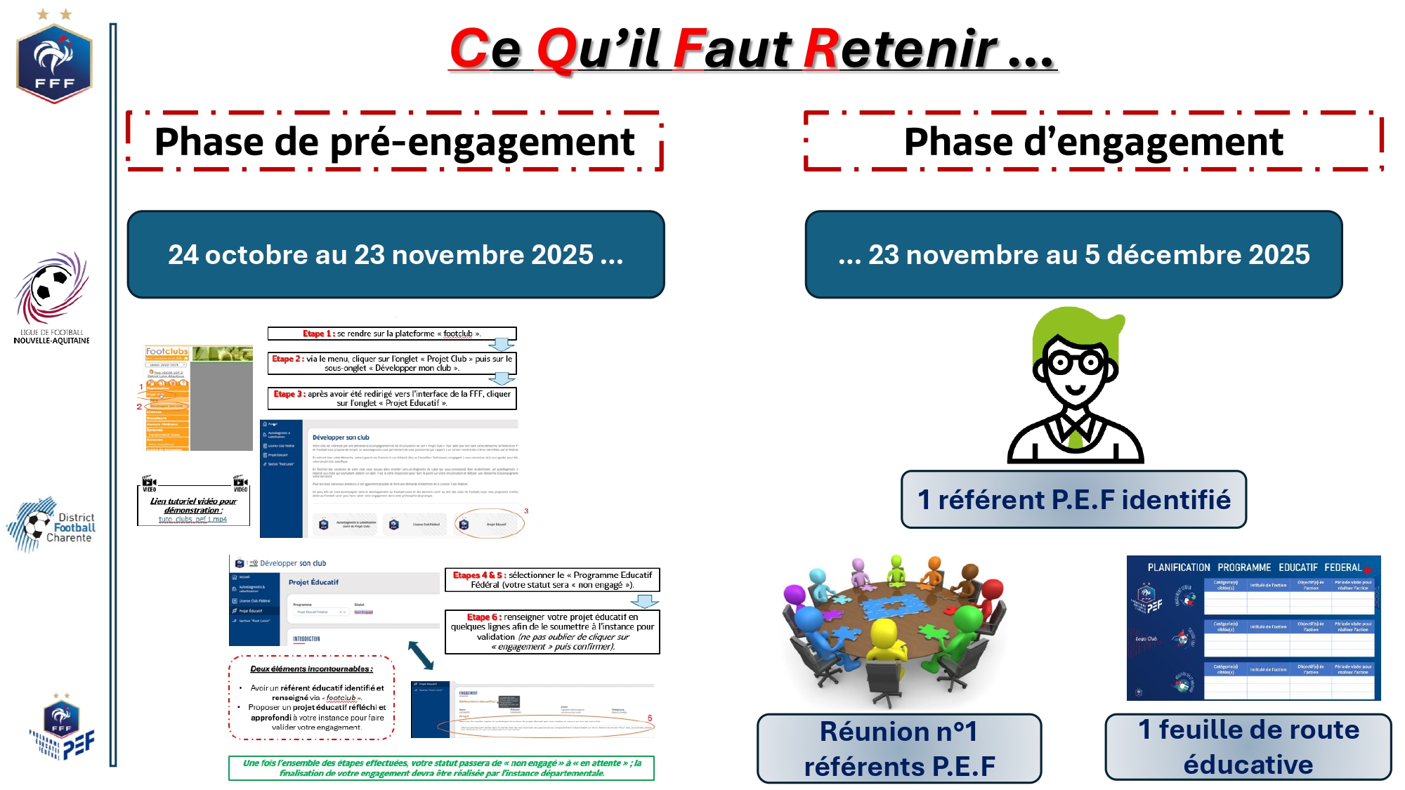 Dans le cadre du déploiement de la politique socio-éducative au sein de nos clubs de football, le District de la Charente propose à nos clubs jeunes de s’engager dans le « Programme Educatif Fédéral » (P.E.F) ; Après une réunion de présentation proposée aux clubs pour un rappel des principes pour certains, ou une découverte du dispositif pour d’autres, la période des pré-engagements est officiellement ouverte.