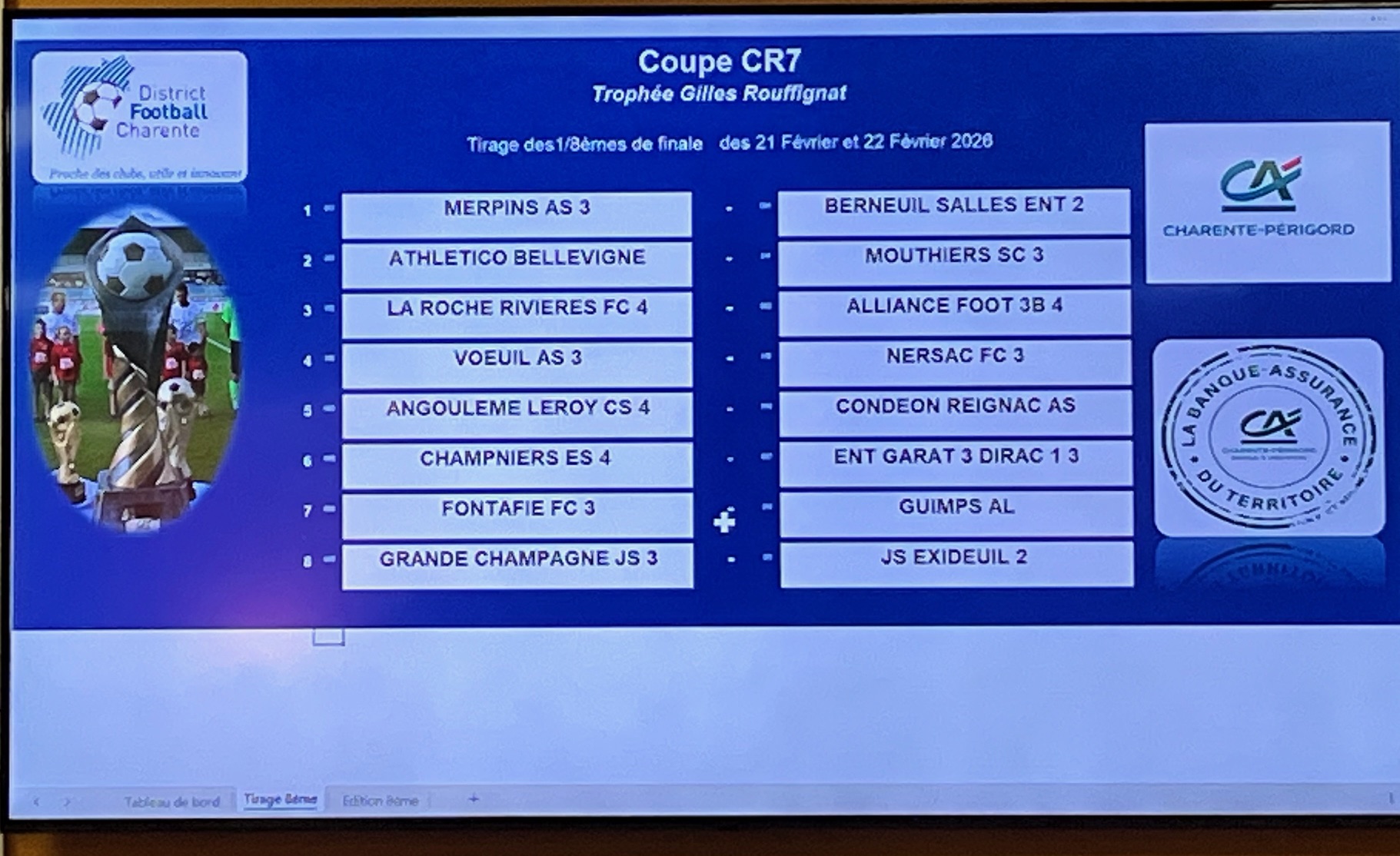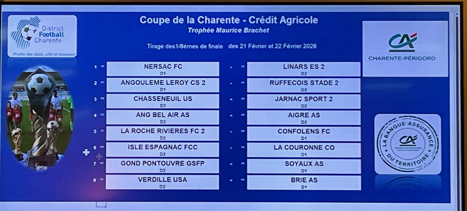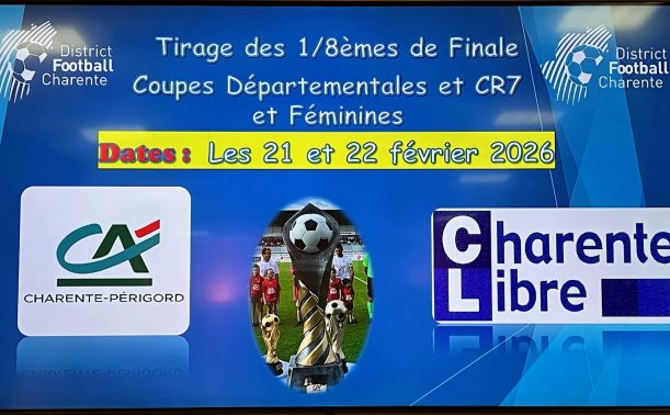 Le District de football de la Charente souhaite une totale réussite aux clubs qualifiés pour les 8emes de finales qui se dérouleront le samedi 21 et le dimanche 22 février 2026.