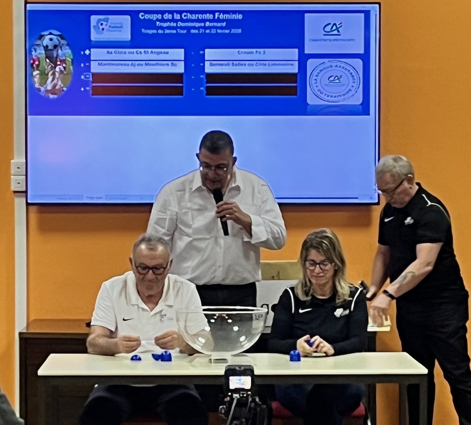 Le tirage au sort des 8èmes de finales des Coupes départementales Crédit Agricole Charente Périgord et du 2ème tour de la Coupe Charente féminines s’est déroulé ce mercredi 28 janvier au District de Football de la Charente, en présence de la commission des compétitions seniors , Laurent Fouché, Secrétaire général du District , Claude Fort animateur de la Commission « développement du football féminin », de nos partenaires Charente Libre et du Crédit Agricole Charente Périgord représenté par Mme Marie Lambert , ainsi que les représentants des clubs encore qualifiés. Voici le tirage en photos :